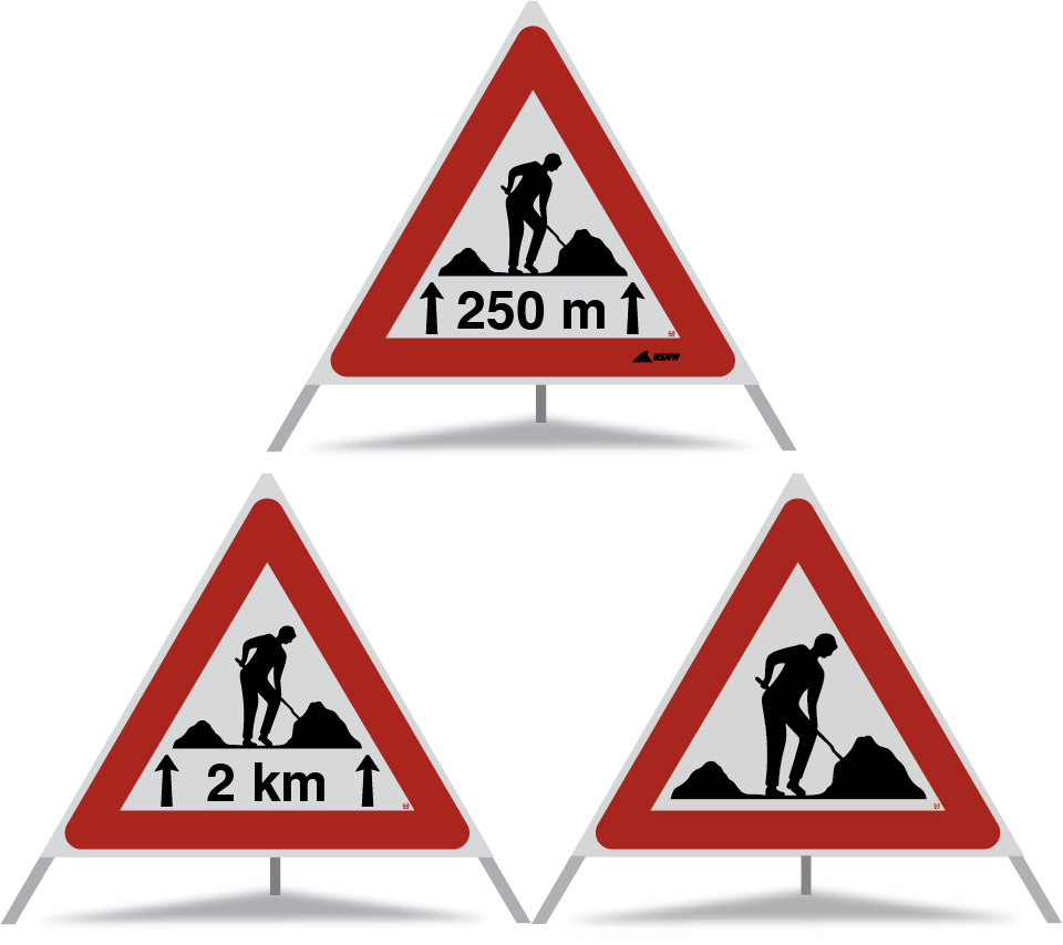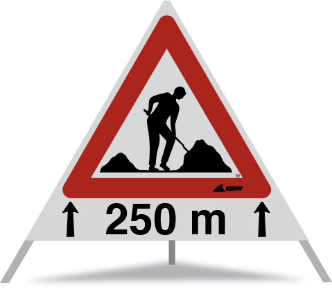 Baustelle 1.14 250m mit Pfeilen R2.110.A (Construction) NSNW (auf rotem Dreieck)