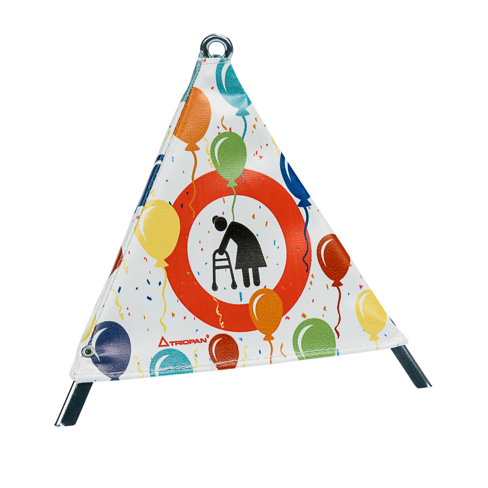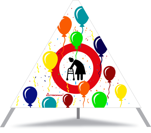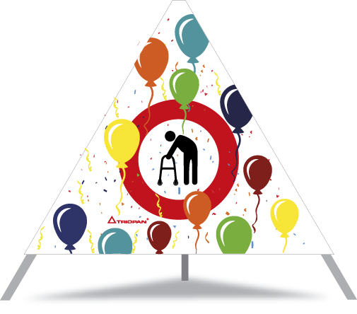 Frau mit Gehhilfe im roten Kreis (Ballone farbig) -